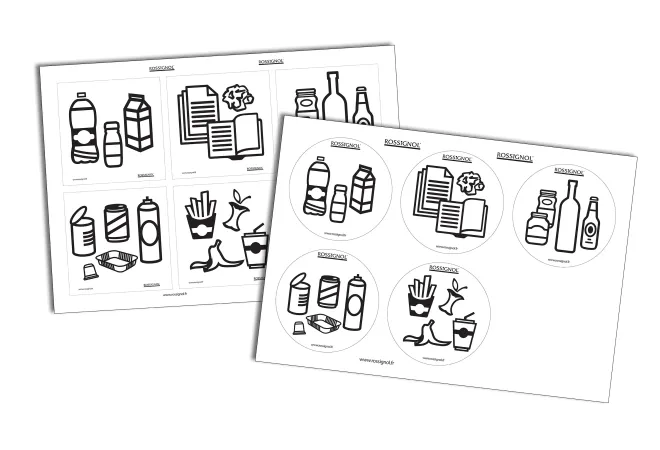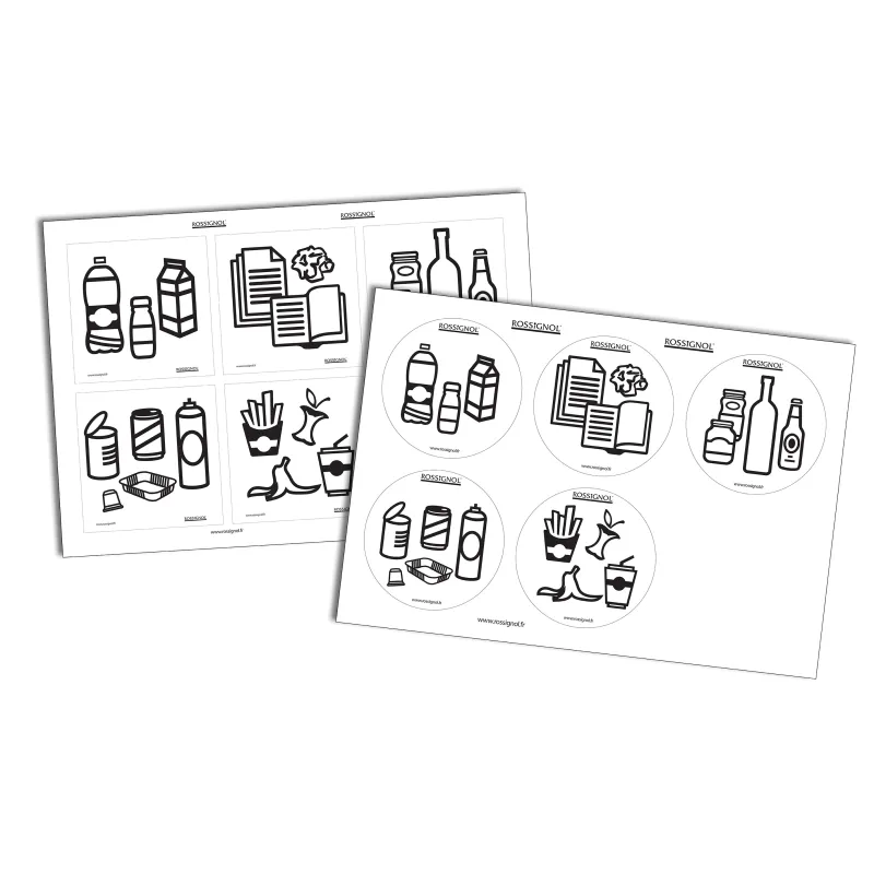 Planches de 5 stickers autocollants pour poubelles de tri sélectif, soit au total 10 autocollants.