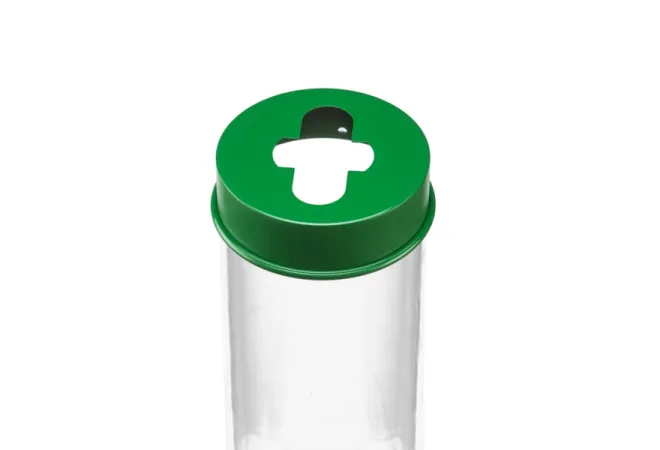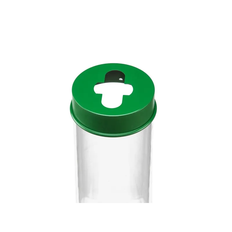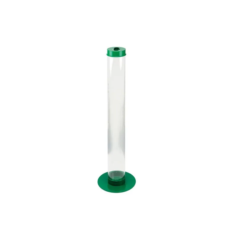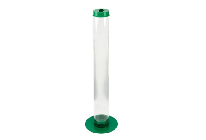 Tube en polycarbonate transparent avec une base et un couvercle en acier laqué ; idéal pour les piles usagées ; contrôle visuel permanent du contenu.