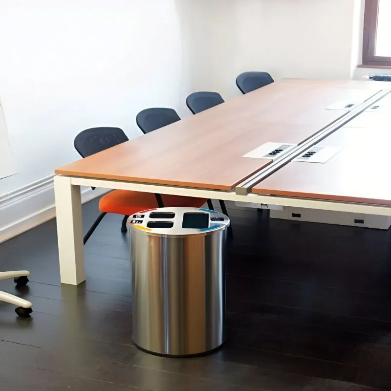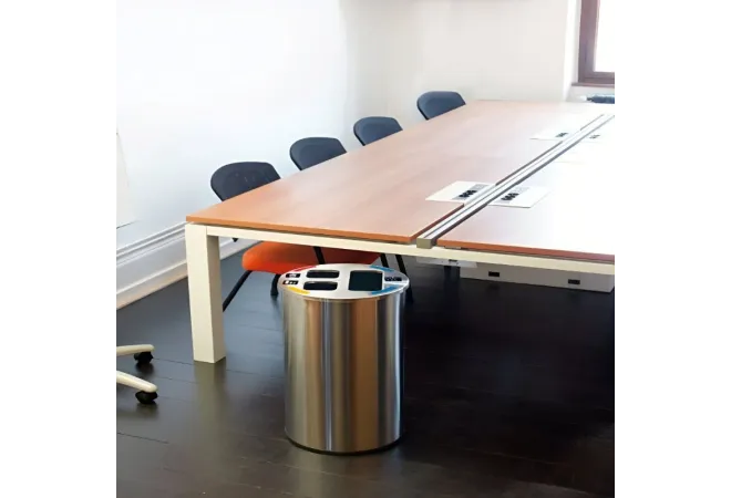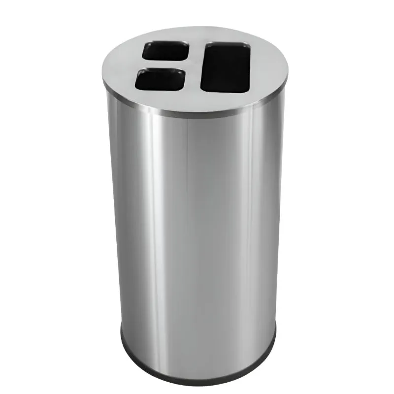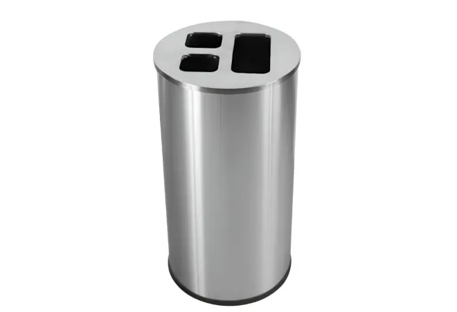 La poubelle tri bureau, d'une contenance de 60 litres, est équipée de 3 bacs intérieurs amovibles à l'aide d'une poignée intégrée. L’identification des déchets se fait par application d’autocollants sur le couvercle. En inox brossé, elle est idéale pour le tri sélectif des déchets dans les salles de conférence, les bureaux, les salles de pause, etc.