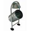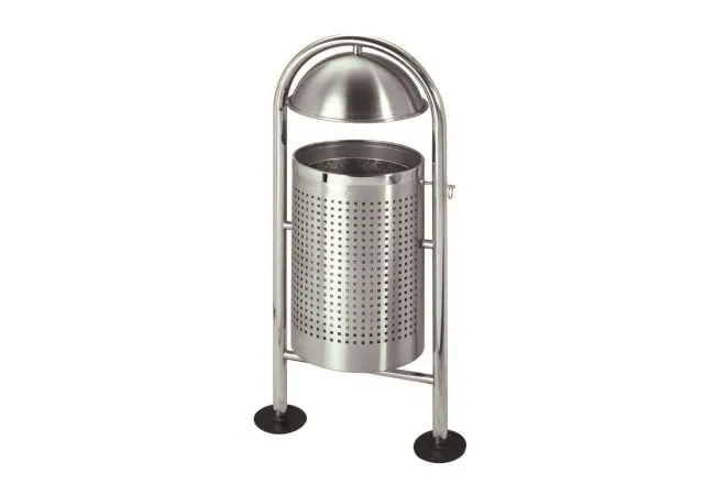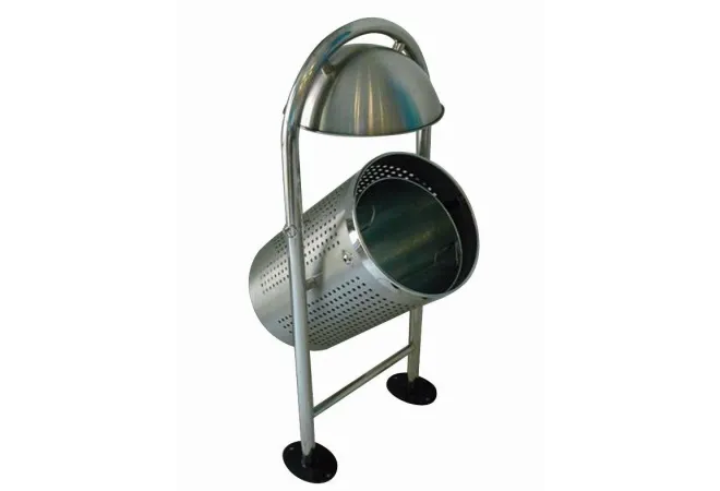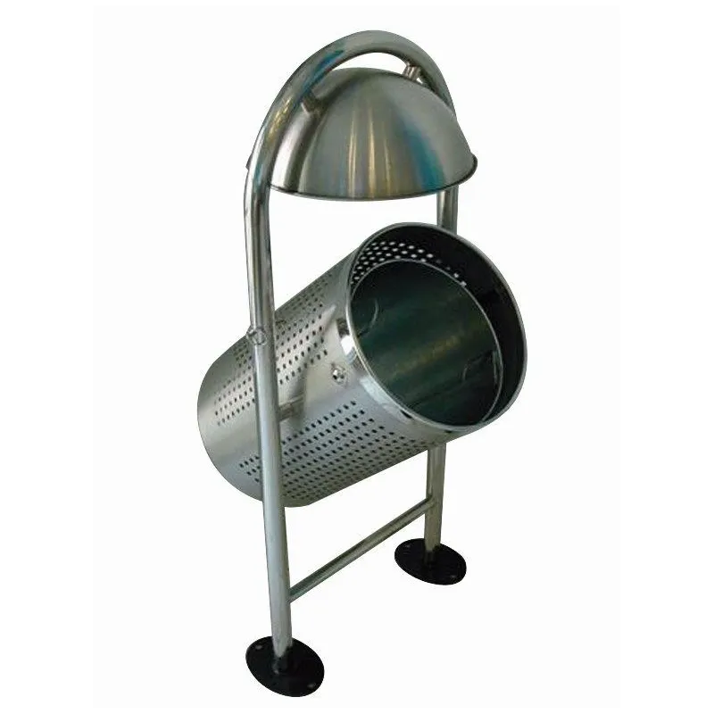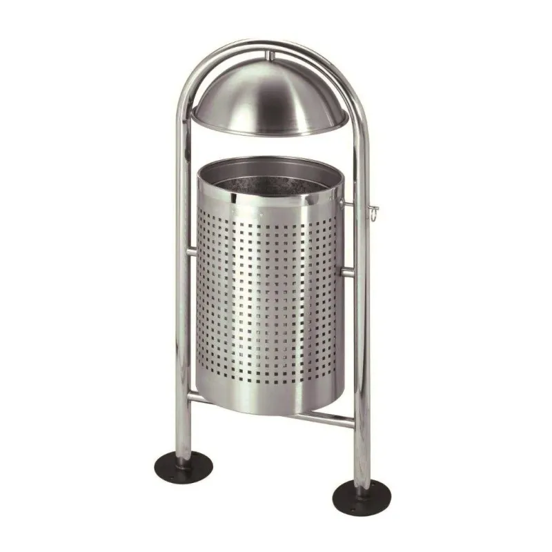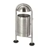 Corbeille de ville à vidage par pivotement en acier inox brillant.