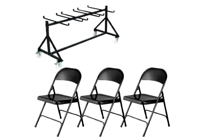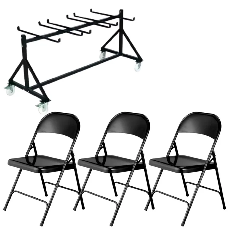 Présentation de la chaise pliante en métal et chariot de transport