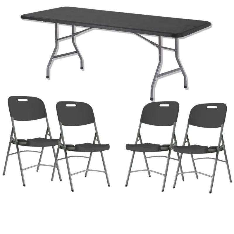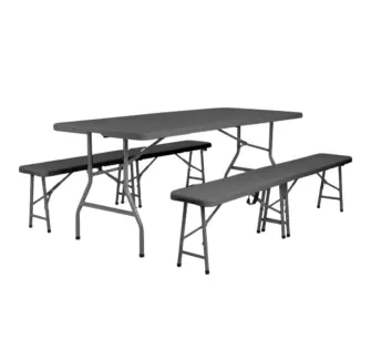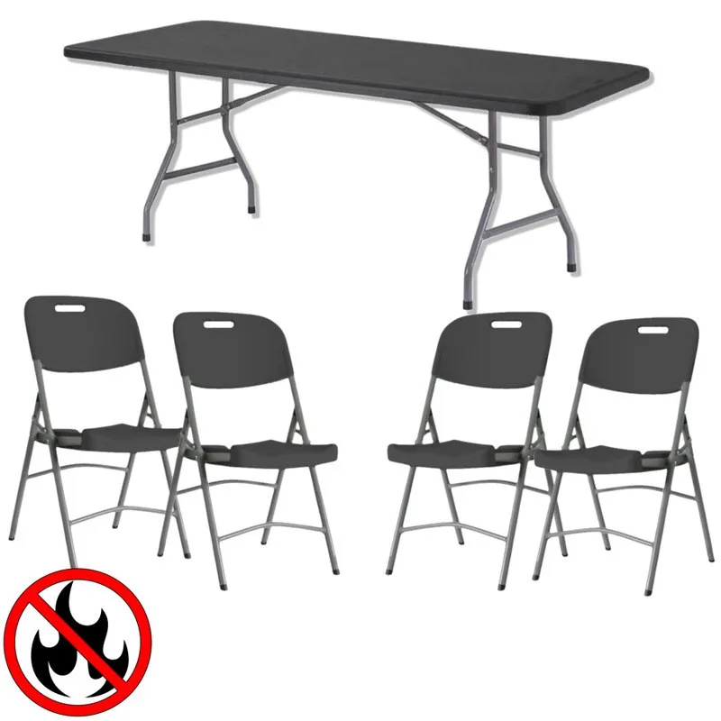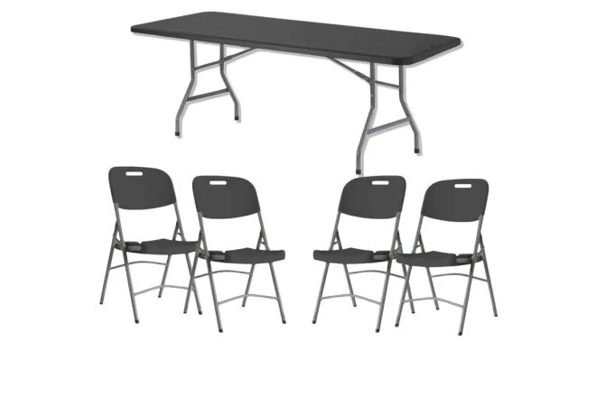 Lot composé de 20 tables pliantes et 120 chaises pliantes en polypropylène classées au feu M2. Les tables font 183 cm de longueur, plateau de couleur gris, piètement pliant. Chaises pliantes en polypro de couleur grise, confortables et ergonomiques. Lot idéal pour les collectivités, associations et entreprises.