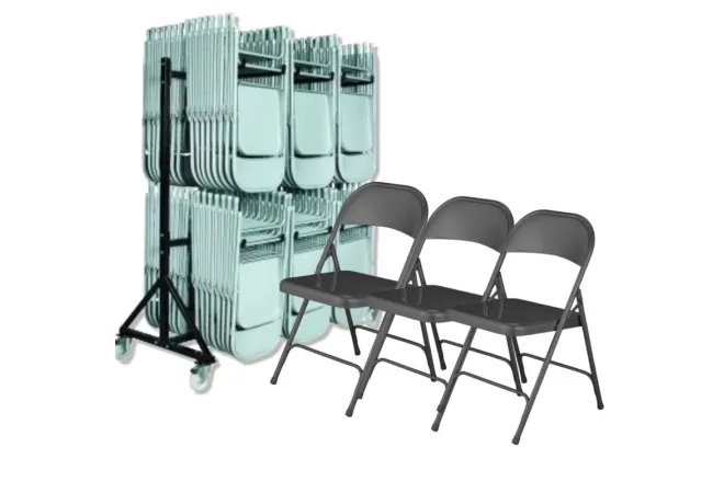 PROMOTION : 60 chaises grises Europ Métal + 1 chariot de transport/stockage. Chaise pliante en métal de couleur grise. Structure en acier galbé avec coins arrondis. Barre de renfort pour plus de robustesse. Chaise assemblable. Chariot en acier sur roulettes pour faciliter les déplacements.