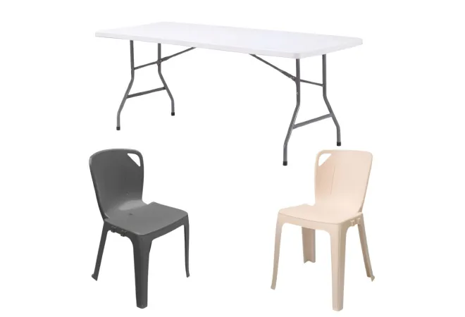 Ce lot se compose de 10 tables pliantes en polypropylène blanches, avec un plateau de 183 cm de long, ainsi que de 60 chaises empilables Elena, classées M4 pour la résistance au feu, disponibles en beige ou gris. Idéal pour l’aménagement de vos espaces recevant du public et l’organisation de vos festivités.