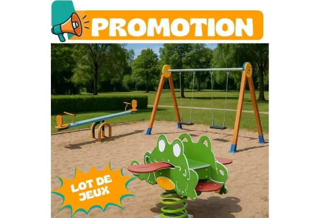 Un lot complet de jeux pour équiper vos espaces de loisirs ! Ce lot comprend un portique double, un jeu à ressort grenouille et une balançoire horizontale, adaptés aux enfants de 3 à 14 ans. Conçus avec des matériaux durables (bois, acier, aluminium, PEHD) et conformes à la norme EN 1176.