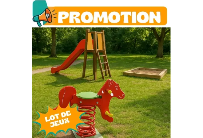 Promotion : 3 jeux pour enfants de 2 à 10 ans. Composé d’un bac à sable, d’un jeu sur ressort et d’un toboggan, idéal pour les aires de jeux publiques et campings.