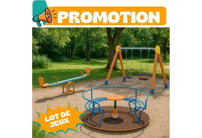 Créez une aire de jeux complète et sécurisée avec ce lot composé d'une balançoire à bascule, d’un tourniquet et d’un portique double. Conçu pour les collectivités, écoles, campings et parcs publics.