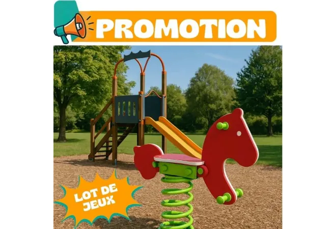 Ce lot complet d’aire de jeux extérieurs est composé d'une structure avec toboggan et d'un jeu sur ressort poney. Parfait pour les collectivités, écoles, campings ou hôtels.