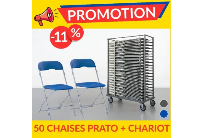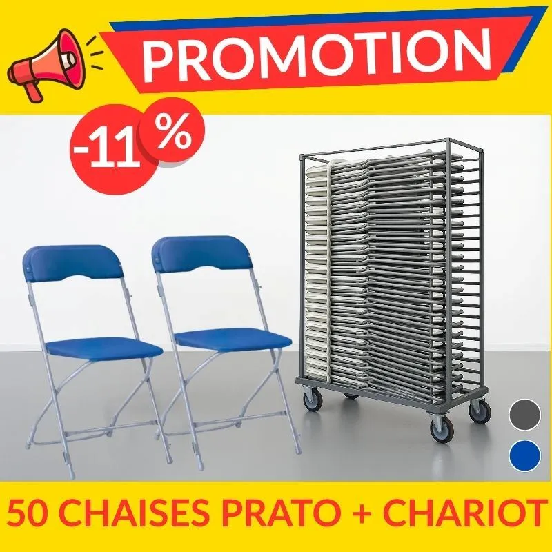 Optimisez vos événements avec notre lot de 50 chaises pliantes Prato et son chariot. Solides et faciles à manipuler, elles se rangent et se transportent rapidement. Idéal pour les collectivités, mairies et associations.