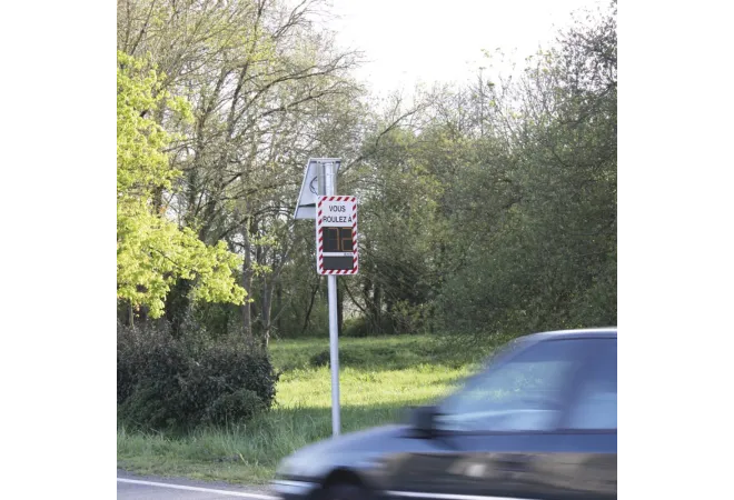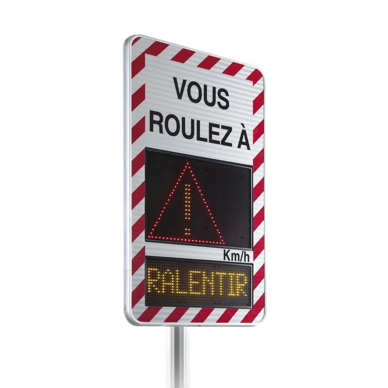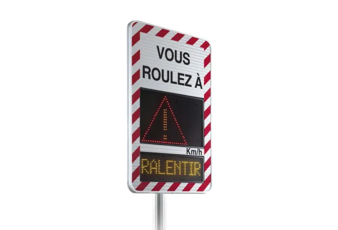 Ce radar à un affichage électronique de Haute Puissance à 3 chiffres et à 3 couleurs d’affichage des Leds : jaune, orange et rouge. Ce radar est visible aussi bien le jour que la nuit, grâce à un listel rétro réfléchissant de classe 2. Graphisme rouge et blanc, conforme aux recommandations du CEREMA.