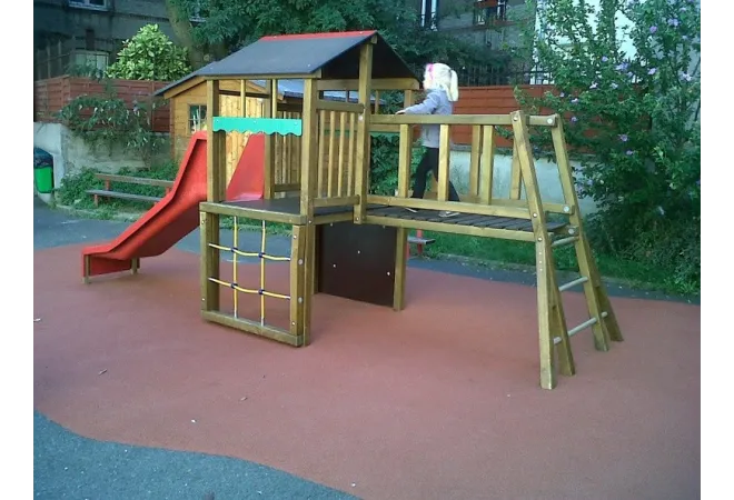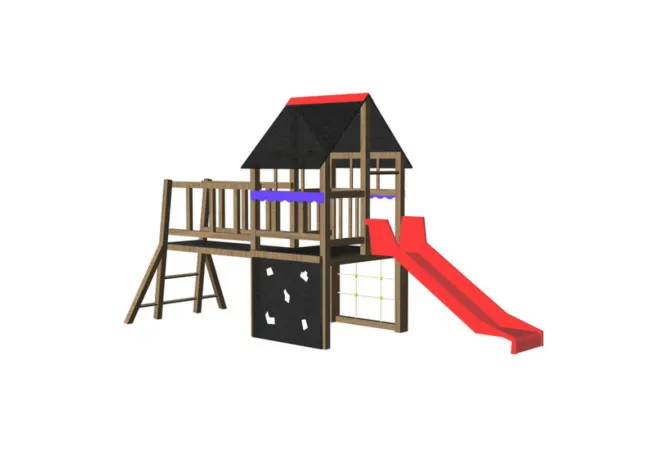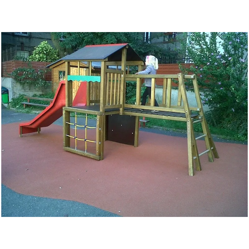 Conçu pour une aire de jeux ou une cour d'école maternelle, ce complexe de jeu extérieur convient aux enfants de 2 à 7 ans. Composé d'un toboggan, d'un cadre à grimper, d'un mur d'escalade, d'une échelle et d'une maisonnette en bois, ce jeu de plein air promet beaucoup d'amusement aux enfants tout en garantissant leur sécurité.