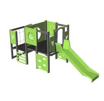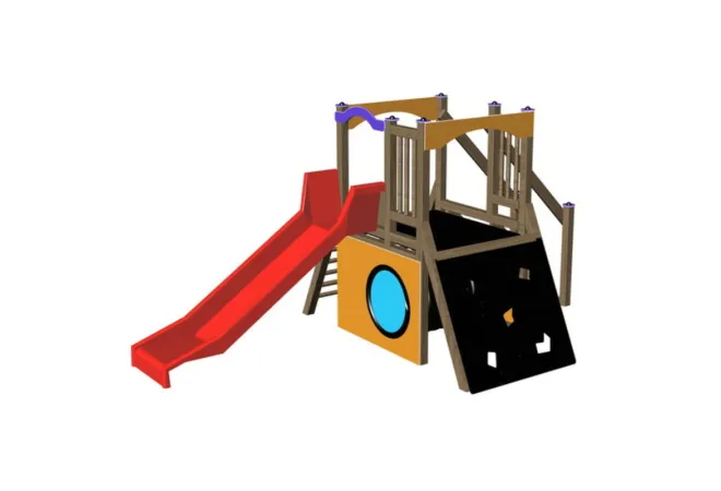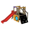 Structure multi-jeux Pitchounette pour enfants de 2 à 7 ans. Fabriquée en pin du nord sans CCA, traitement autoclave classe IV. Contient une glissière, 1 mur d'escalade antidérapant, 1 plancher carré antidérapant, 1 échelle inclinée, 1 escalier avec des rambardes et 1 tunnel.
