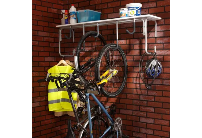 Le range vélos suspendu est une étagère murale qui vous permettra de ranger 5 vélos contre le mur en toute sécurité. Cet accroche-vélo suspendu en tubes d’acier permet un gain de place au sol. Le support à vélos suspendu est livré avec des crochets gainés pour protéger les vélos.
