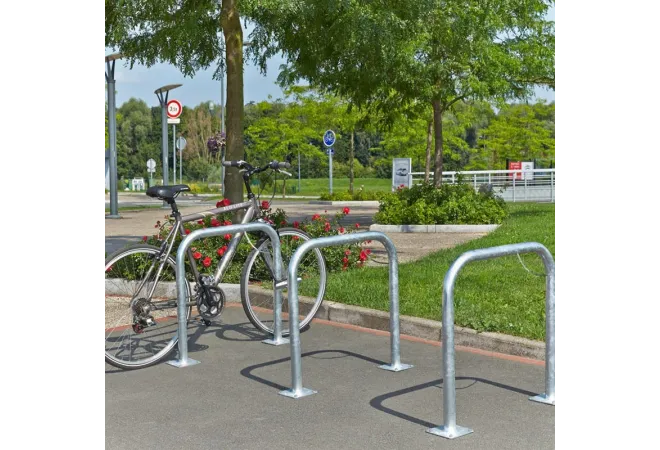 Une barrière en acier, très pratique et peu encombrante, pour le stationnement des vélos. Une barrière en acier galvanisé disposant d'un arceau anti glissement pour plus de stabilité, idéale lorsque l'on dispose de peu de place. Cette barrière est à fixer au sol sur platines, les platines peuvent être plongées dans le béton pour être scellées. Plusieurs barrières installées les unes à côté des autres feront de votre lieu un magnifique endroit pour stationner les vélos.