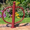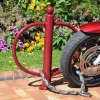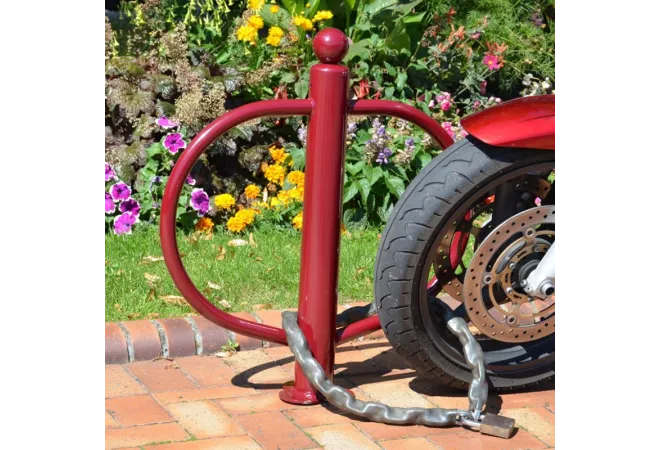 Un poteau avec double arceaux pour garer les motos et les sécuriser avec un antivol. Poteau à fixer au sol sur platine avec 6 points de serrage. Possibilité de sécuriser sa moto avec un antivol en forme de U ou une chaîne.