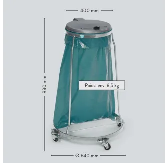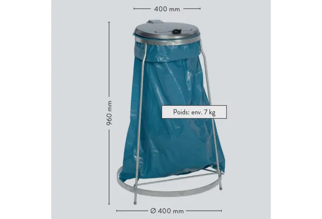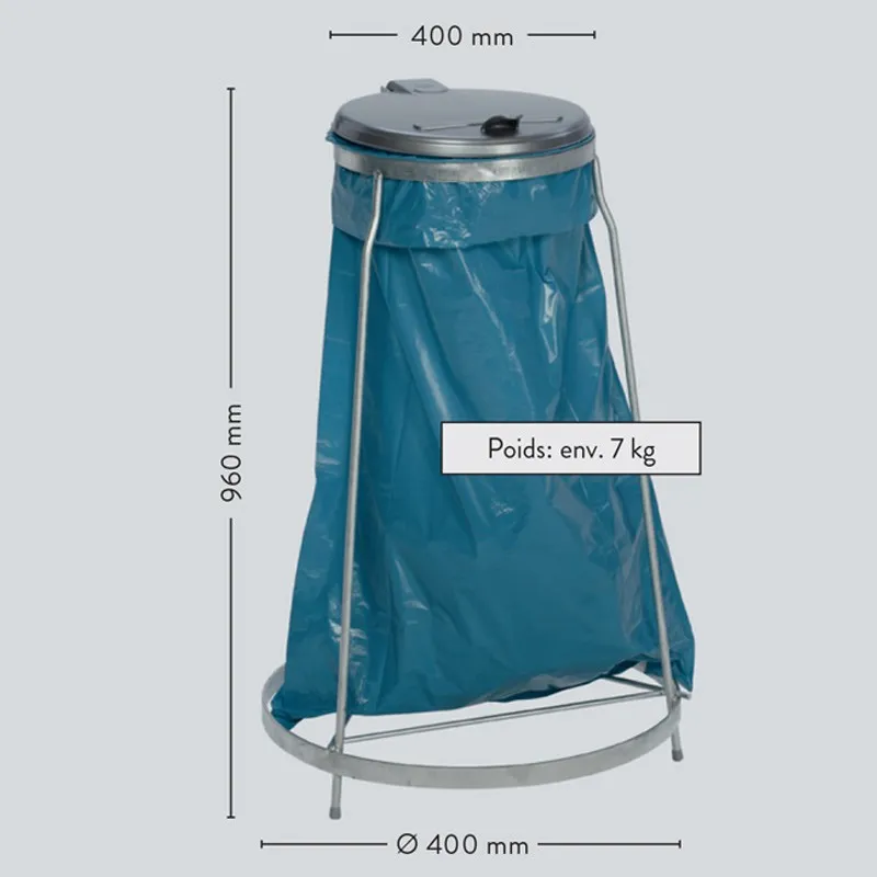 Le support pour sac poubelle est en acier galvanisé à chaud. Il possède un anneau de serrage pour fixer le sac et le maintenir en place. Ce support pour sac est empilable, ce qui permet de gagner de la place lors du stockage. Choix du couvercle : en acier ou en plastique.