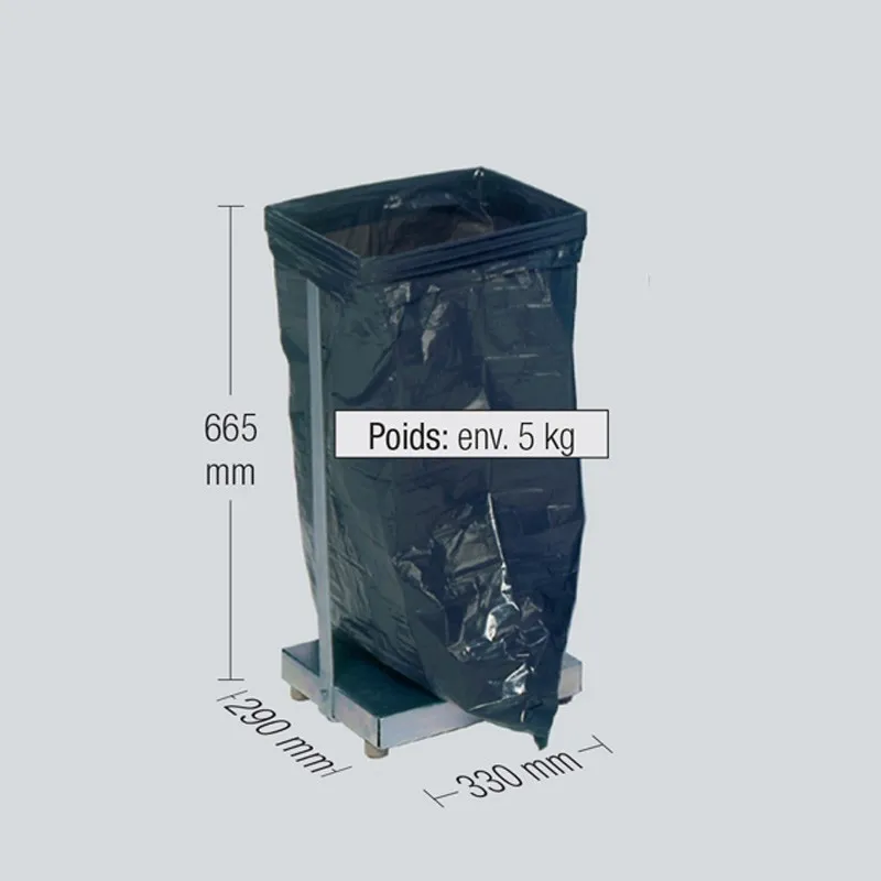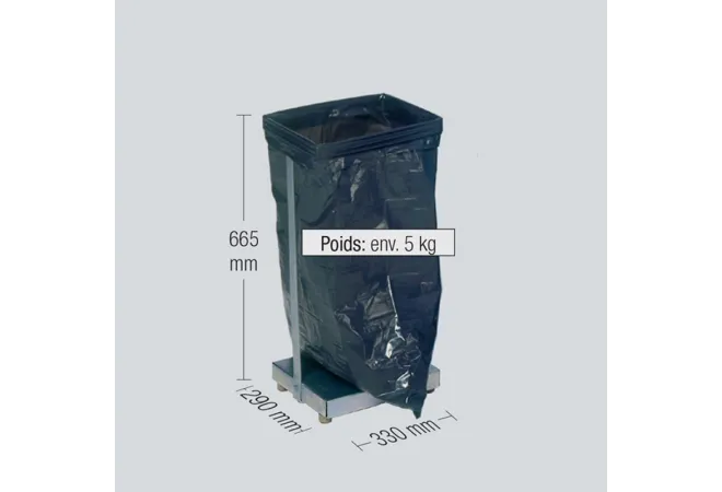 Un support pour sac poubelle disposant d'un fond pour maintenir le sac en place lors de son utilisation. Ce support est conçu avec un fond en métal et 2 bras type râteau qui maintiendront le sac en position d'usage.