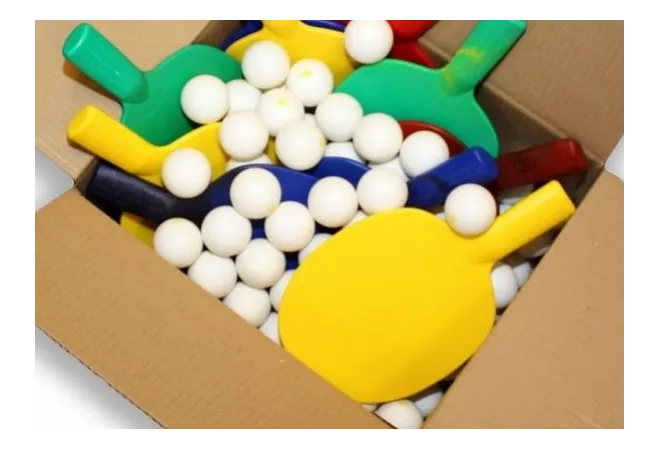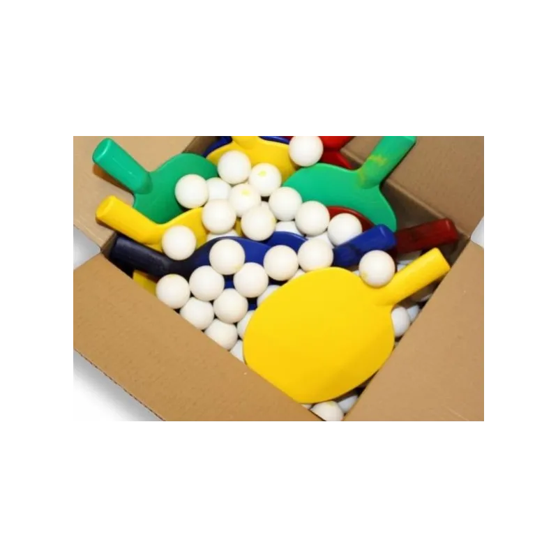 Le kit est composé de 100 balles et 10 raquettes colorées pour jouer au ping-pong.