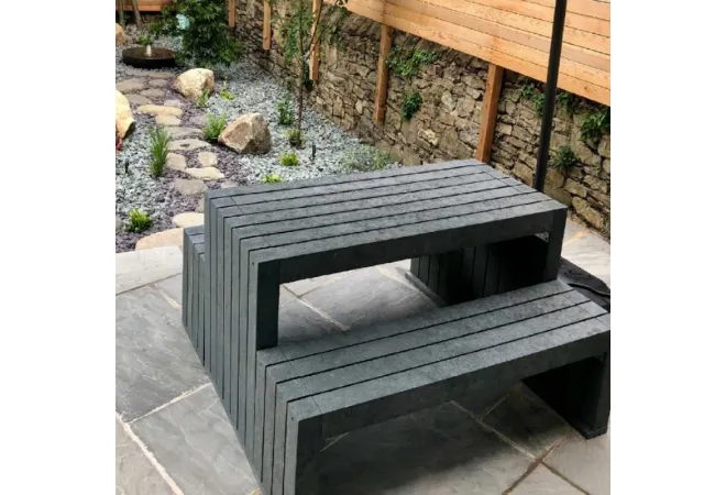 La table de pique-nique en plastique recyclé, avec son design cubique, est idéale pour les aménagements extérieurs des collectivités. Robuste et sans écharde, elle ne nécessite aucun entretien particulier.