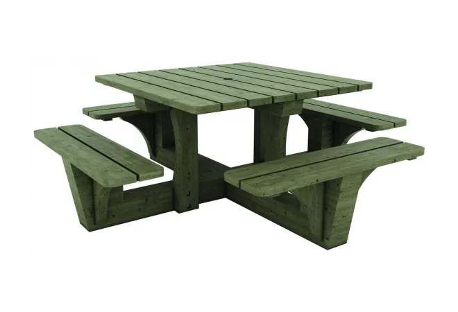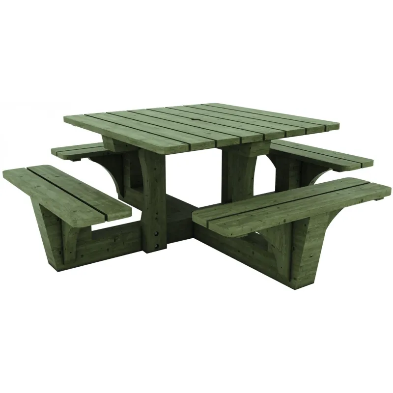 Pour l'aménagement des aires de repos et des espaces collectifs, la table de pique-nique carrée Essen est idéal. La conception en pin du nord est renforcée par un traitement autoclave IV certifié FSC pour une gestion responsable des forêts. L'ensemble est muni d'un trou pour la pose d'un parasol, ainsi que d'une visserie en inox.