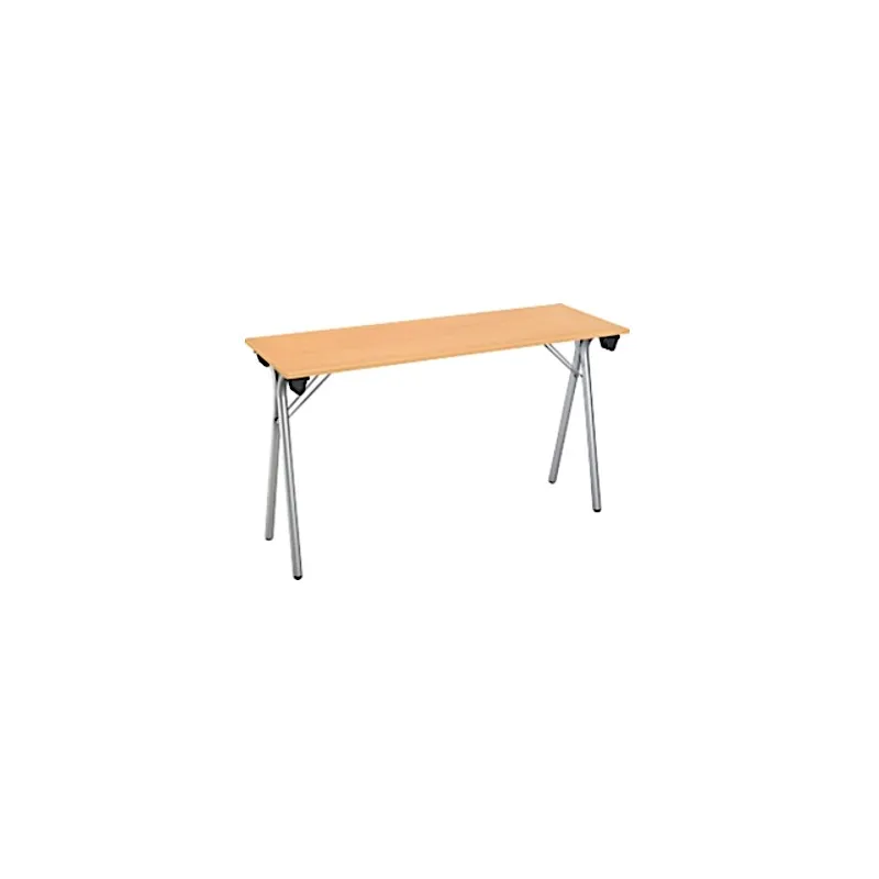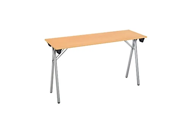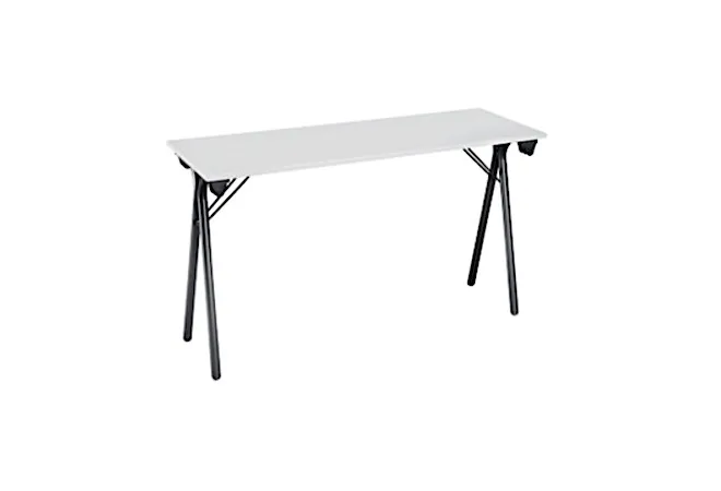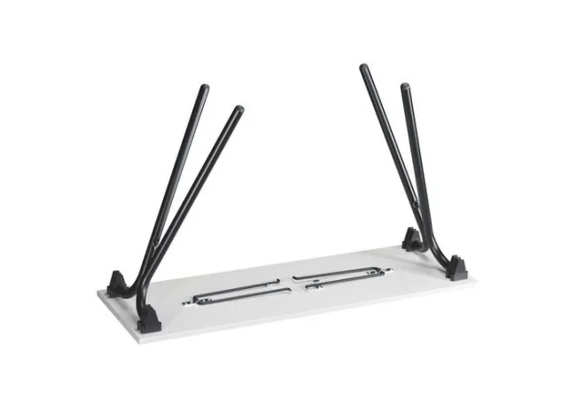 Table de formation disposant d'un piètement pliant sous le plateau, permettant un gain de place lors de son stockage.