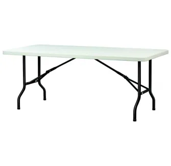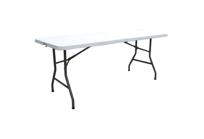 Idéale pour toutes vos manifestations, buffets, étalages, marchés, brocantes, etc. Leader Équipements vous propose la table valise pliante en 2 en polypropylène 183 x 76 cm. La table de forain pliante en 2 est économique et facile à transporter avec son plateau réalisé en polyéthylène haute densité en deux parties, ses barres de renfort sous le plateau, l'encastrement des pieds, et son système de blocage du piétement en position ouverte. Le moulage de renfort aux angles de cette table pliante de forain, et ses poignées vous permettent de l'utiliser et surtout de la transporter facilement là où vous le souhaitez !
