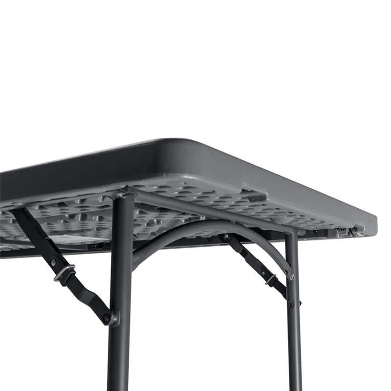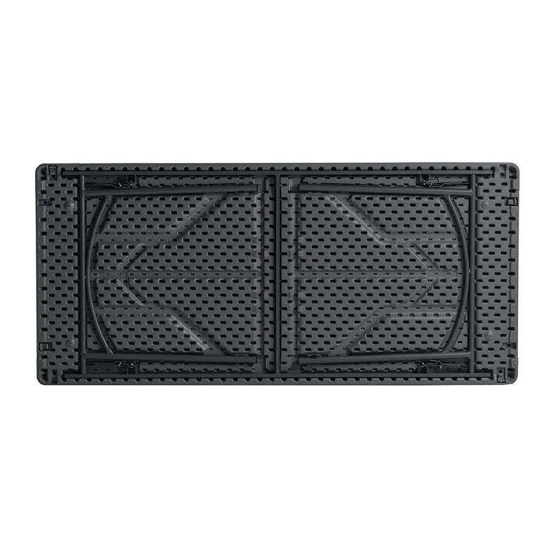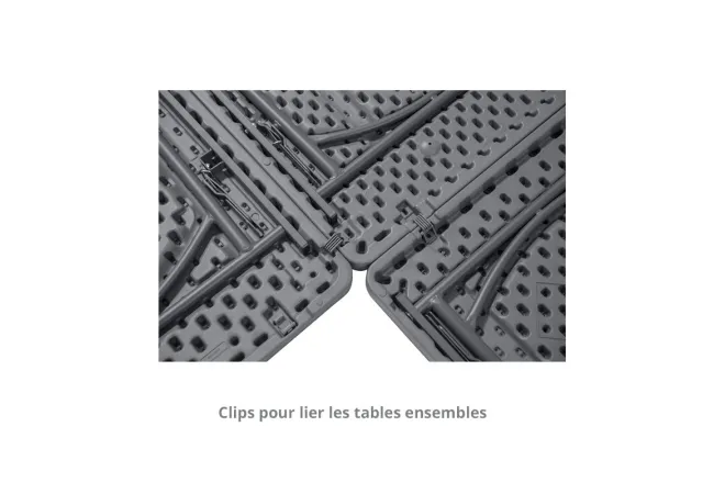 Cette grande table pliante de réception en polypropylène de haute qualité peut recevoir jusqu'à 6 personnes. Elle est équipée d'anneaux de sécurité en position d'utilisation. Notre table pliante pour 6 personnes inclut des patins antibruit sous ses pieds cylindriques, pour pouvoir la déplacer en silence.