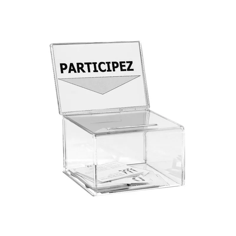 Pour toutes vos élections, choisissez l'urne de comptoir petit modèle avec porte affiche en plexi 200 bulletins. Réalisée en plexi transparent d'épaisseur 4 mm, cette petite urne transparente pour jeux concours possède une fente d'introduction de 86 mm x 6 mm.
